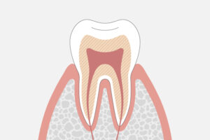 虫歯菌が歯の内部にまで浸食し、象牙質まで進行している状態です。黒ずみの範囲が広くなるとともに、熱いものや冷たいものを飲食した時に歯がしみたり、痛みを感じたりといった自覚症状が現れ始めます。